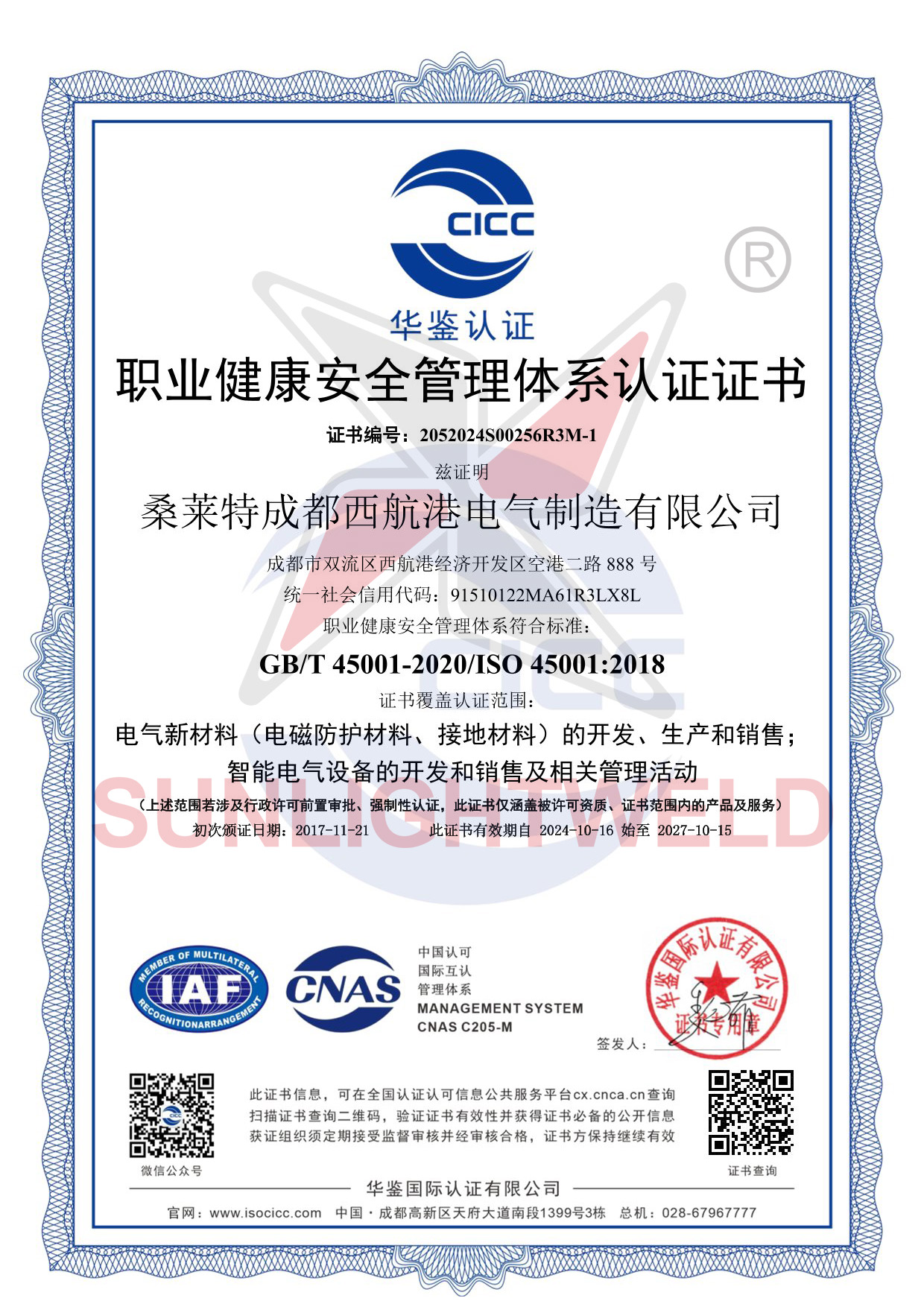 职业健康安全管理体系认证证书