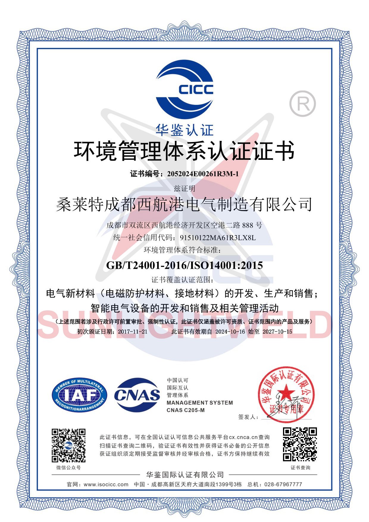 环境管理体系认证证书